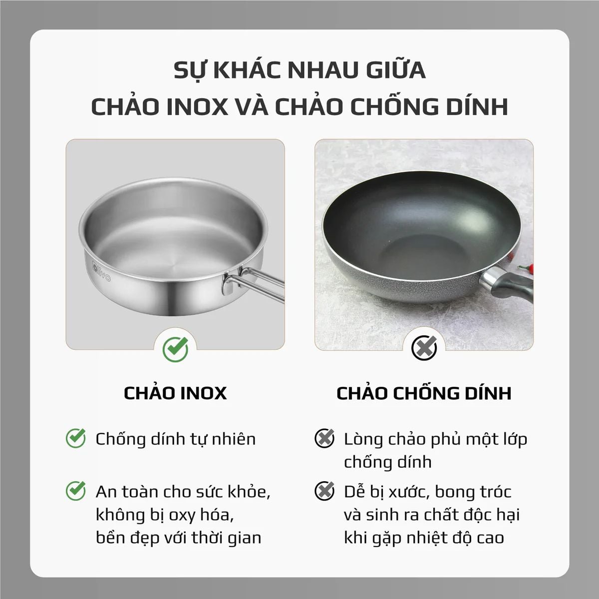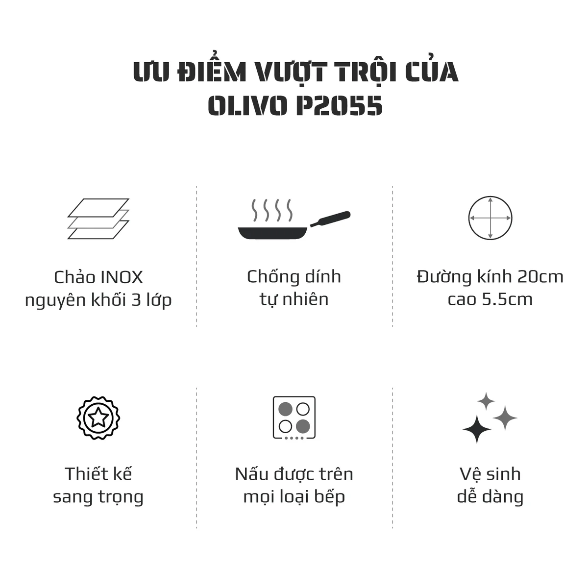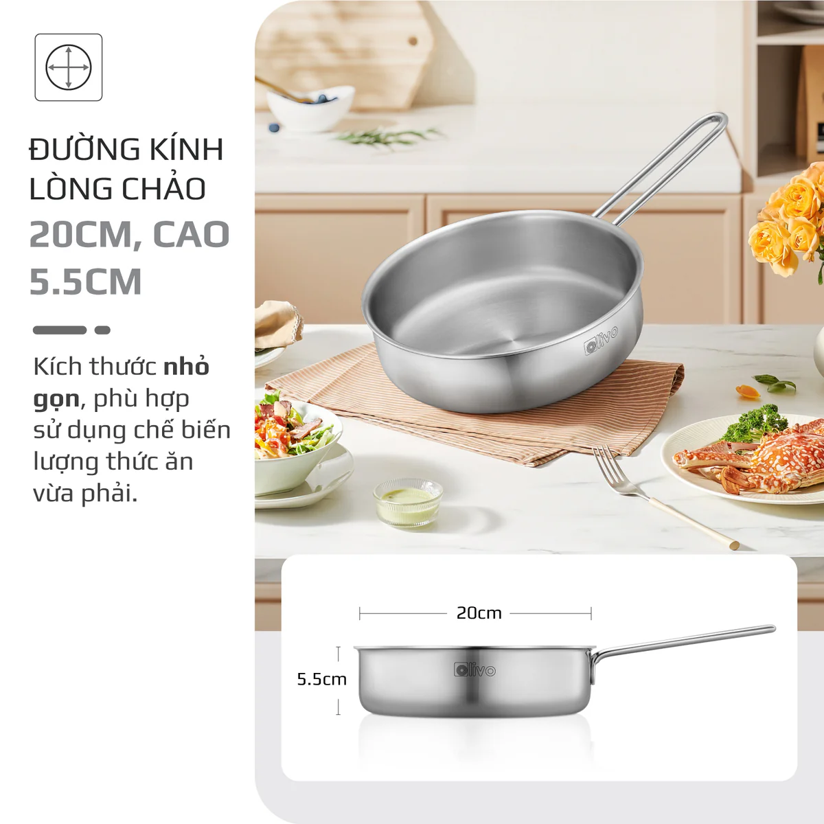 CHẢO INOX OLIVO P2055 – Chống Dính Tự Nhiên, Đường Kính 20cm, Sâu Lòng 5.5cm, Nấu Được Trên Mọi Loại Bếp
