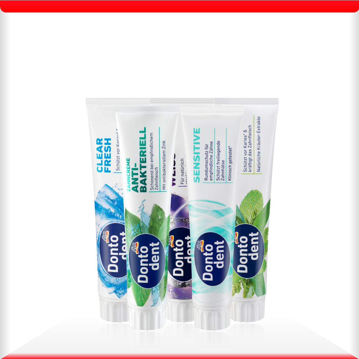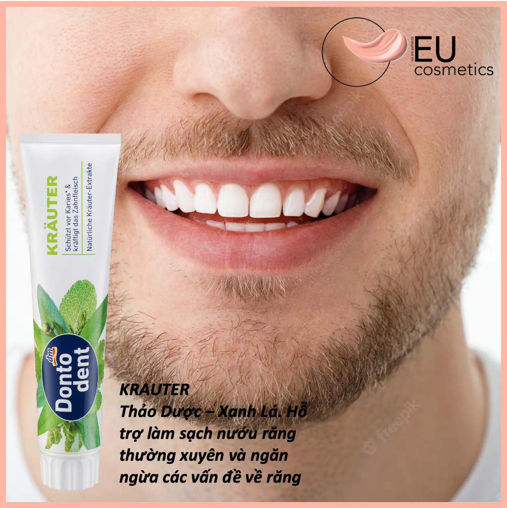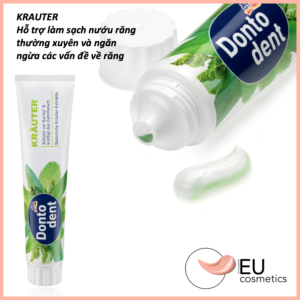 Kräuter (xanh lá): Các loại thảo mộc trong Dontodent Krauter bảo vệ chống lại bệnh sâu răng và củng cố nướu răng, hỗ trợ tăng cường các nướu răng và giúp ngăn chặn các vấn đề về răng nướu.