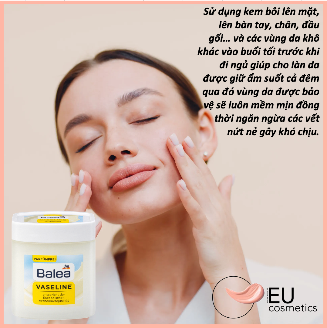 Sử dụng kem nẻ Balea Vaseline bôi lên mặt, lên bàn tay, bàn chân, đầu gối… và các vùng da khô khác vào buổi tối trước khi đi ngủ giúp cho làn da được giữ ẩm suốt cả đêm qua đó vùng da được bảo vệ sẽ luôn mềm mịn đồng thời ngăn ngừa các vết nứt nẻ gây khó chịu.