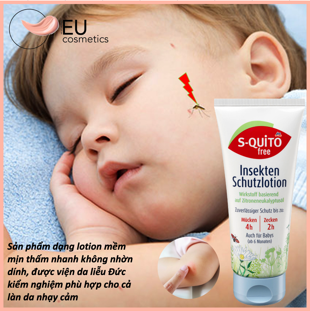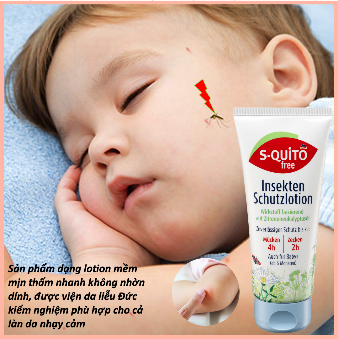 Kem dưỡng da chống côn trùng từ S-quitofree dành cho làn da mỏng manh của trẻ sơ sinh và trẻ nhỏ cũng như làn da nhạy cảm, mang lại sự bảo vệ đáng tin cậy và ngay lập tức trong tối đa 4 giờ chống lại vết côn trùng cắn và lên đến 2 giờ chống lại vết cắn của bọ ve và ruồi ngựa. Kem dưỡng da có chứa thành phần hoạt chất dựa trên dầu khuynh diệp chanh và có mùi hương đặc biệt tinh tế và dễ chịu. Dễ dàng lây lan và hấp thụ mà không để lại bất kỳ dư lượng nào. Khả năng tương thích của da cũng được xác nhận về mặt da liễu.