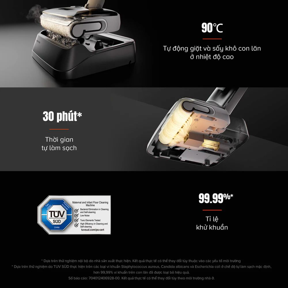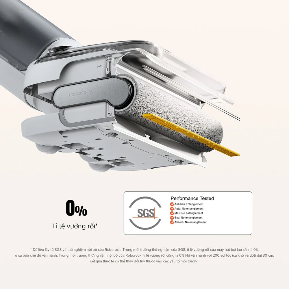Roborock F25 RT sở hữu lực hút mạnh mẽ lên đến 20.000 Pa, tỷ lệ vướng rối 0%. Máy cũng được trang bị tính năng tự động giặt và sấy khô con lăn ở nhiệt độ cao 90°C.