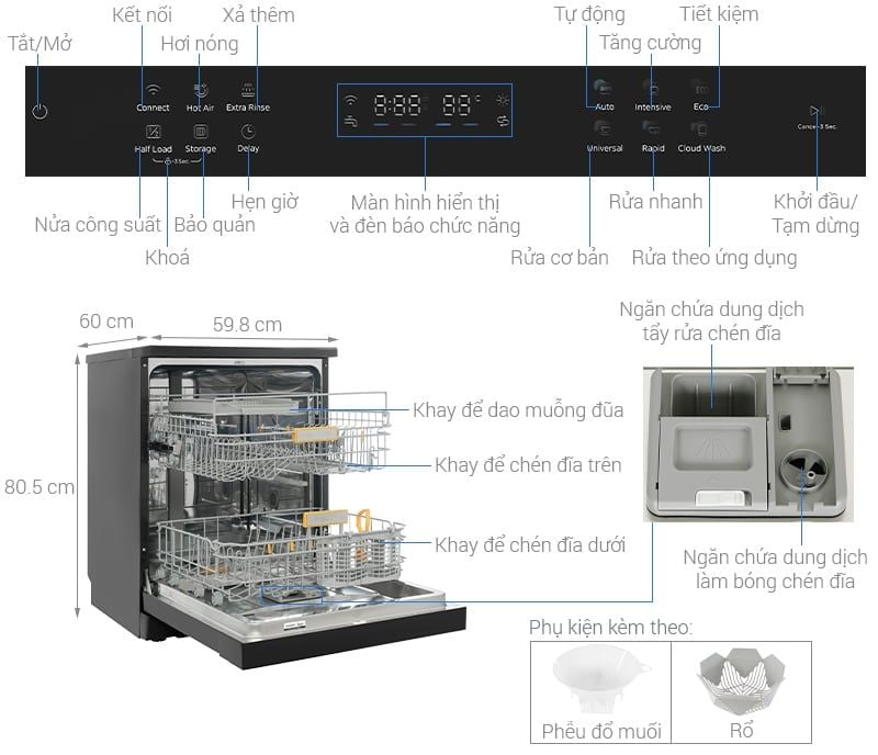 Bên cạnh đó, máy còn có các chương trình tùy chọn thêm: rửa nửa tải (Half Load) khi số lượng đồ dùng cần rửa ít hơn, chức năng bảo quản (Storage) giúp giữ chén bát luôn khô và ấm khi đã rửa xong.