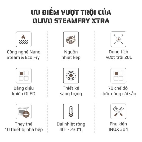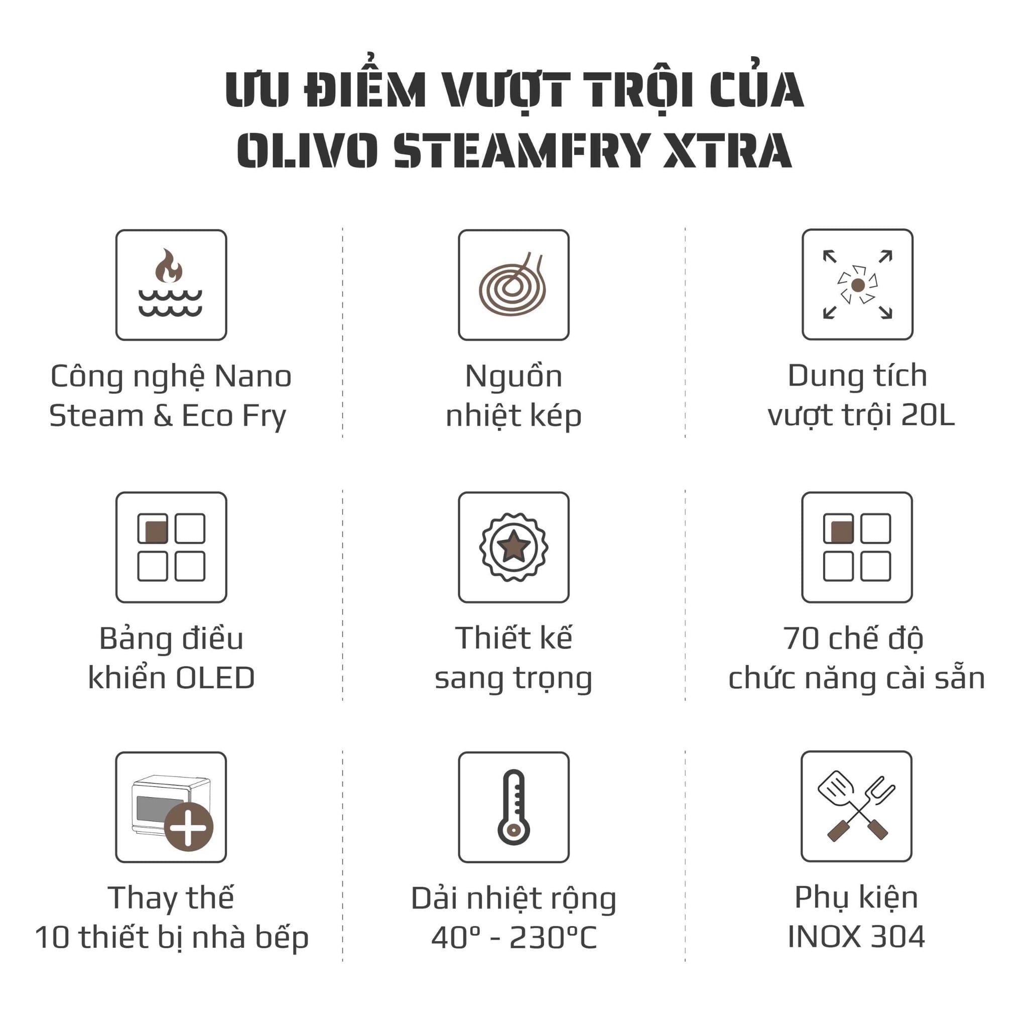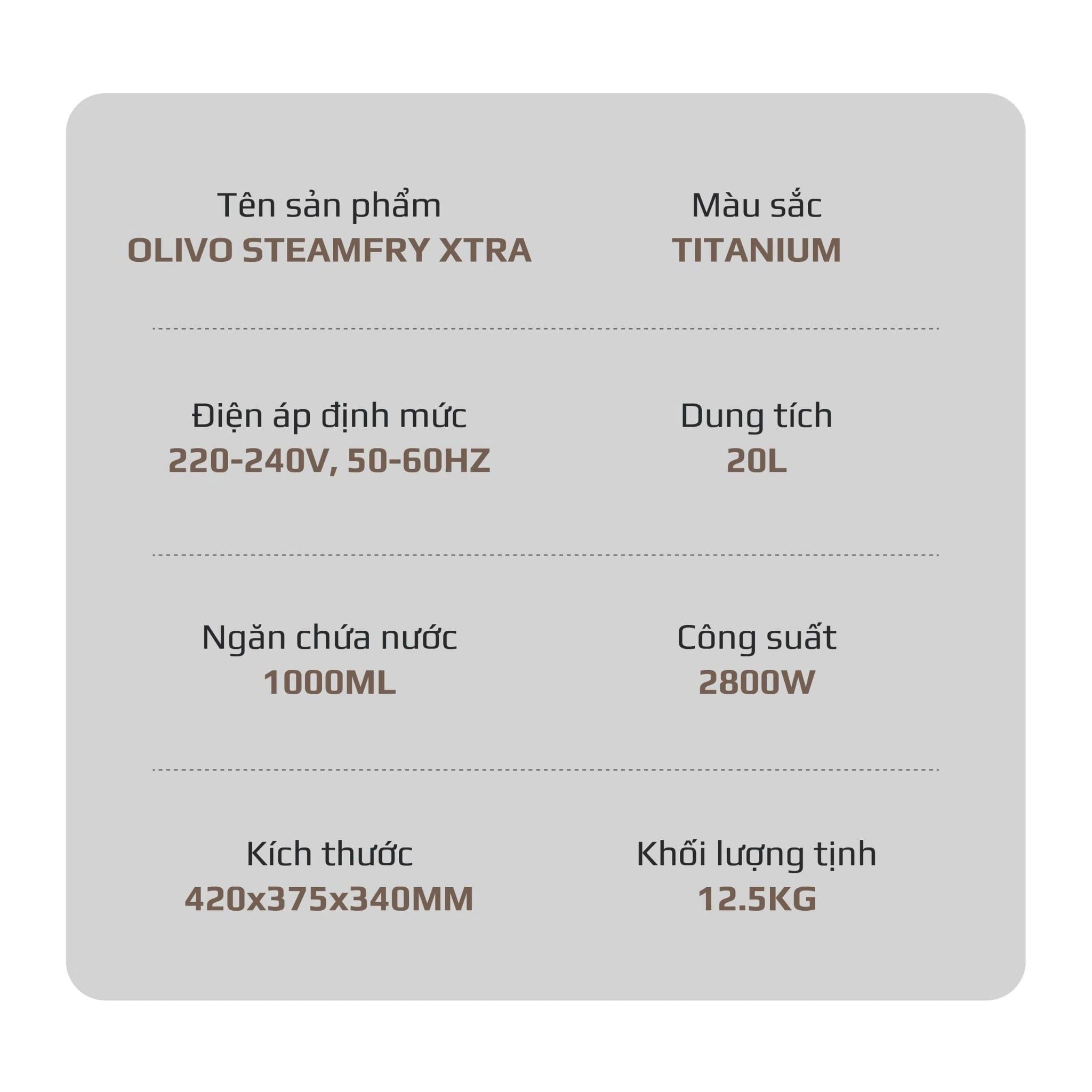 Olivo SteamFry Xtra là lựa chọn hoàn chỉnh cho gia đình hiện đại: nấu gọn - ăn ngon - bếp sang - thao tác nhàn.