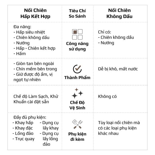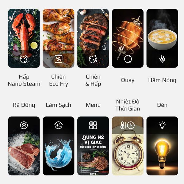 6. Công nghệ hấp Nano Steam giúp món hấp chín đều, mềm ẩm, giữ trọn dinh dưỡng. Công nghệ chiên Eco Fry món ăn vàng giòn, ít dầu mỡ, tốt cho sức khỏe.