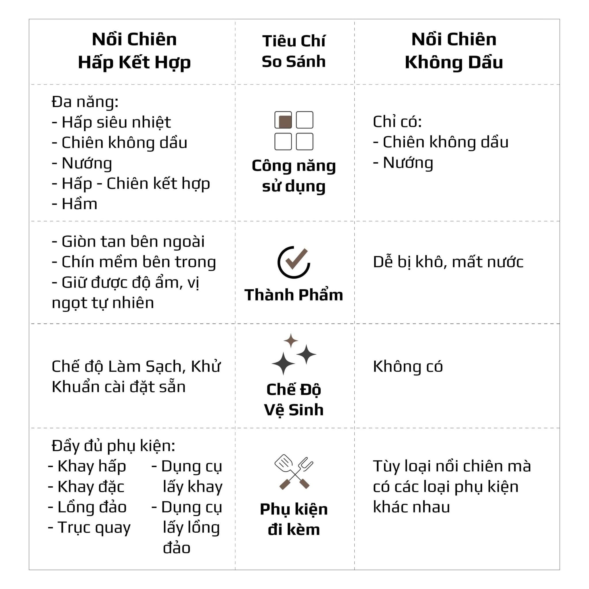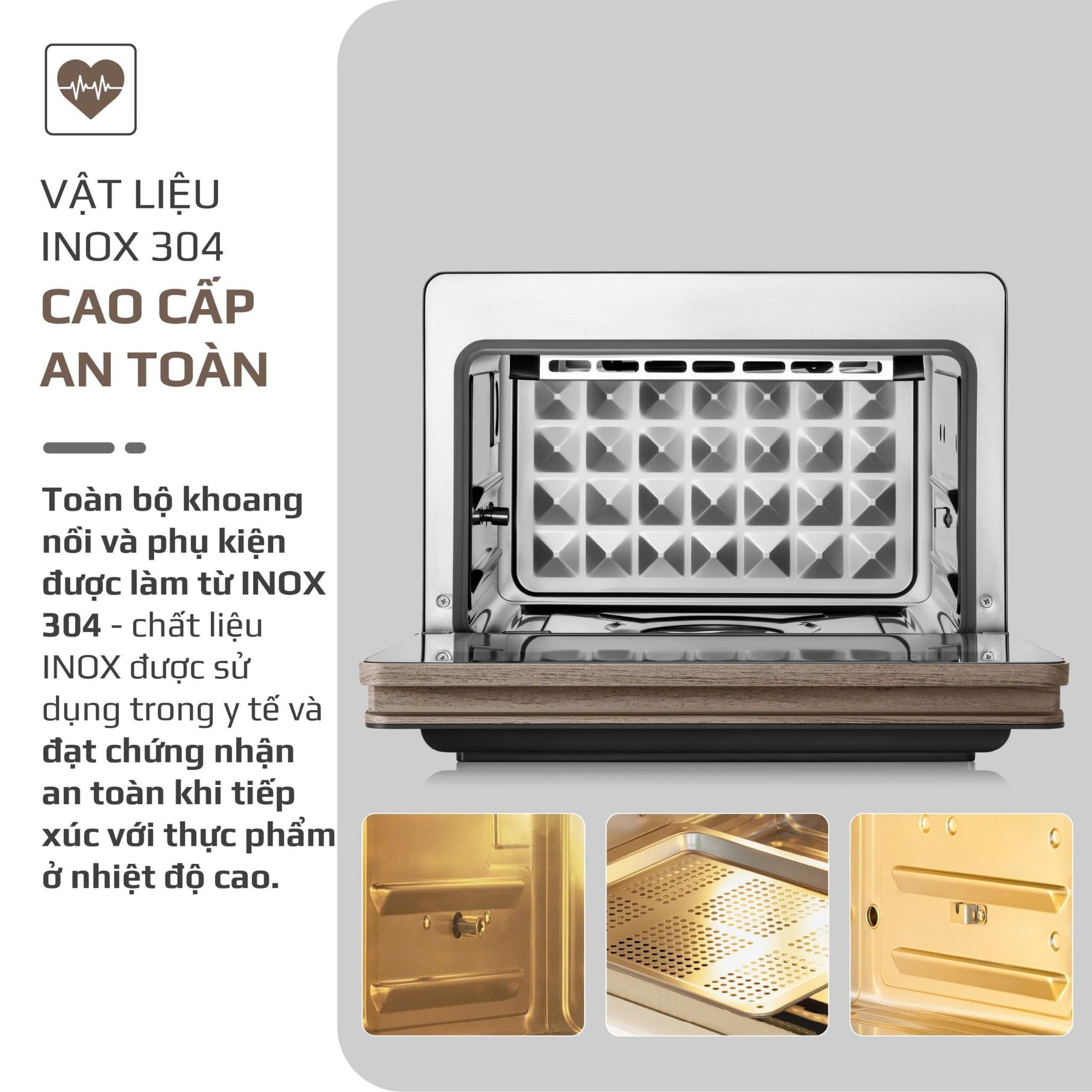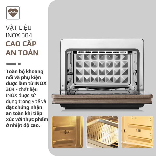 7. Vật liệu Inox 304 an toàn từ khoang nồi đến phụ kiện. Bộ phụ kiện đầy đủ: Khay hấp, khay đặc, lồng quay, giá chiên, trục xiên, găng tay, sách hướng dẫn và sách công thức “Bùng nổ vị giác”.