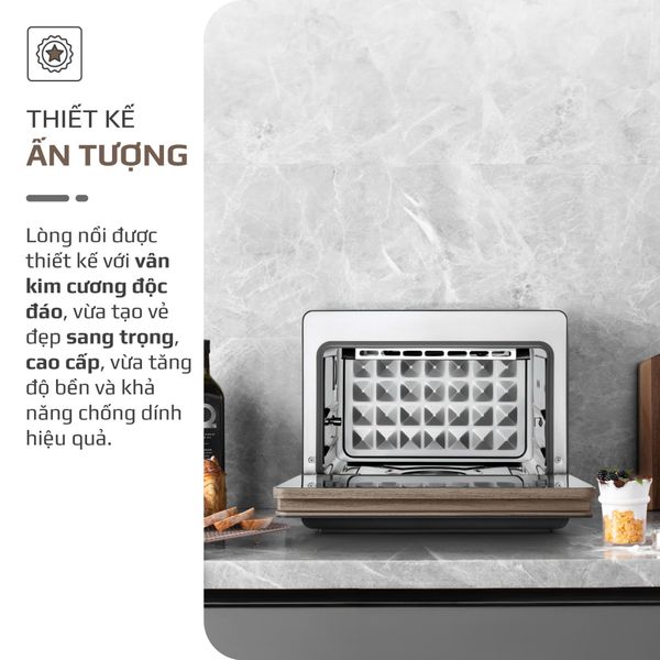 5. Thiết kế cao cấp, khác biệt: Khoang nồi Inox 304 vân kim cương chống bám bẩn, dễ vệ sinh. Màu Titanium phối vân gỗ vừa sang trọng vừa ấm áp cho không gian bếp.