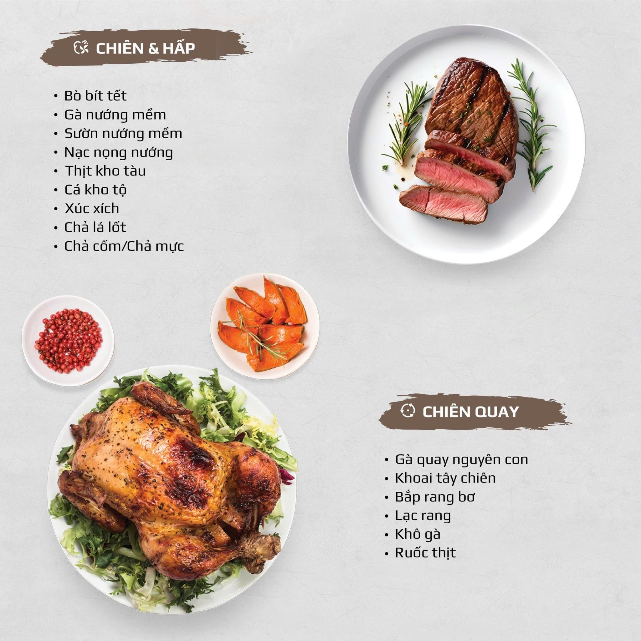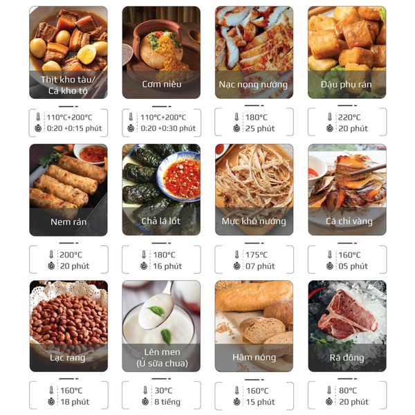 3. Thêm nhiều món Việt tiện lợi: Thịt quay giòn bì, cá kho tộ, cơm niêu, nem rán, chả lá lốt, đậu phụ rán, sữa chua, rã đông, hâm nóng… 70 chế độ nấu cài sẵn tự động cài nhiệt và thời gian chuẩn.
