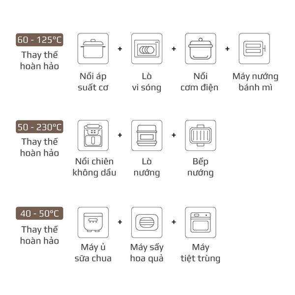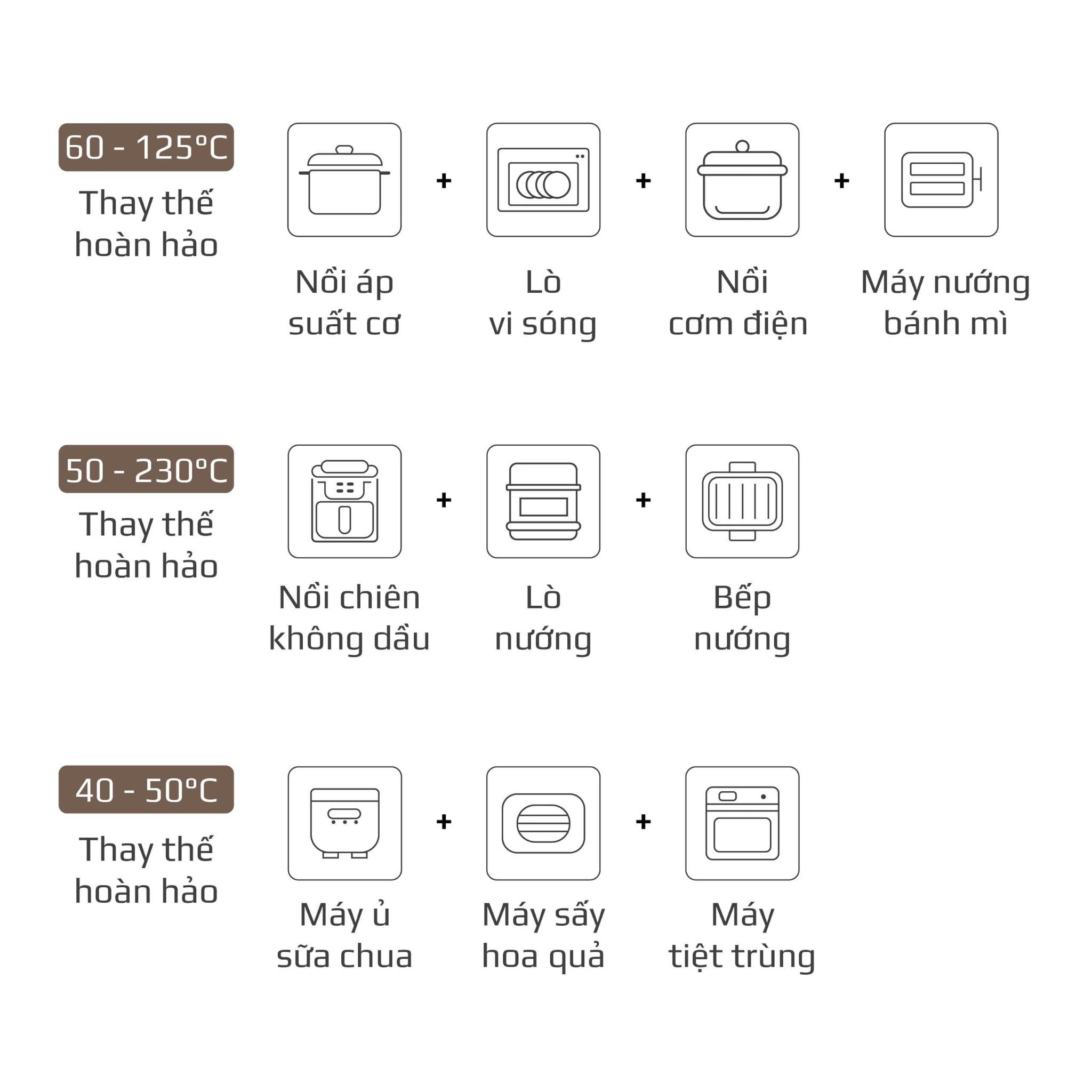 8. Dải nhiệt rộng 40-230 độ: Linh hoạt từ ủ sữa chua, sấy hoa quả đến quay, nướng, chiên nhiệt cao. Thay thế nhiều thiết bị bếp - 01 chiếc nồi đáp ứng chiên - nướng - hấp - quay - làm bánh,... tiết kiệm không gian và thời gian nấu nướng.