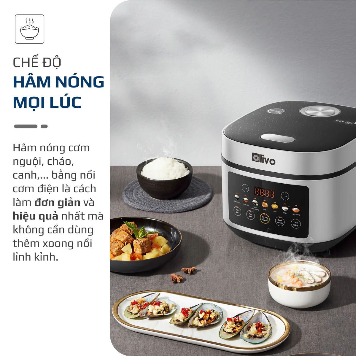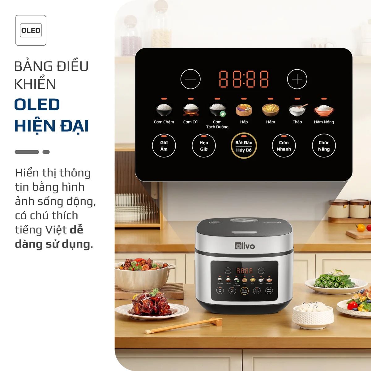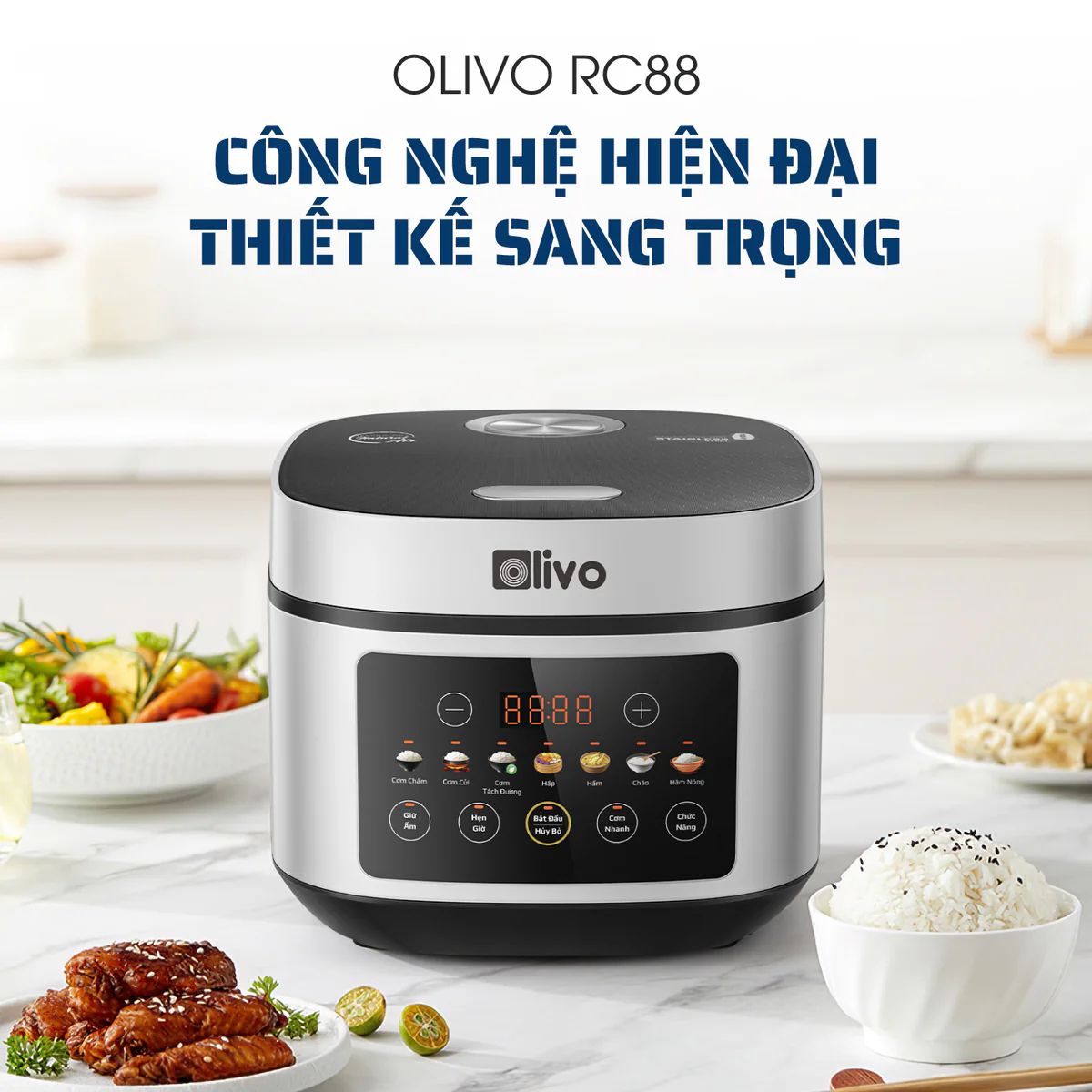 Nồi Cơm Điện OLIVO RC88 – Lòng Nồi INOX 304 Chống Dính Tự Nhiên, Bảng Điều Khiển OLED Sống Động, Nấu Cơm Ngon, Thiết Kế Sang Trọng