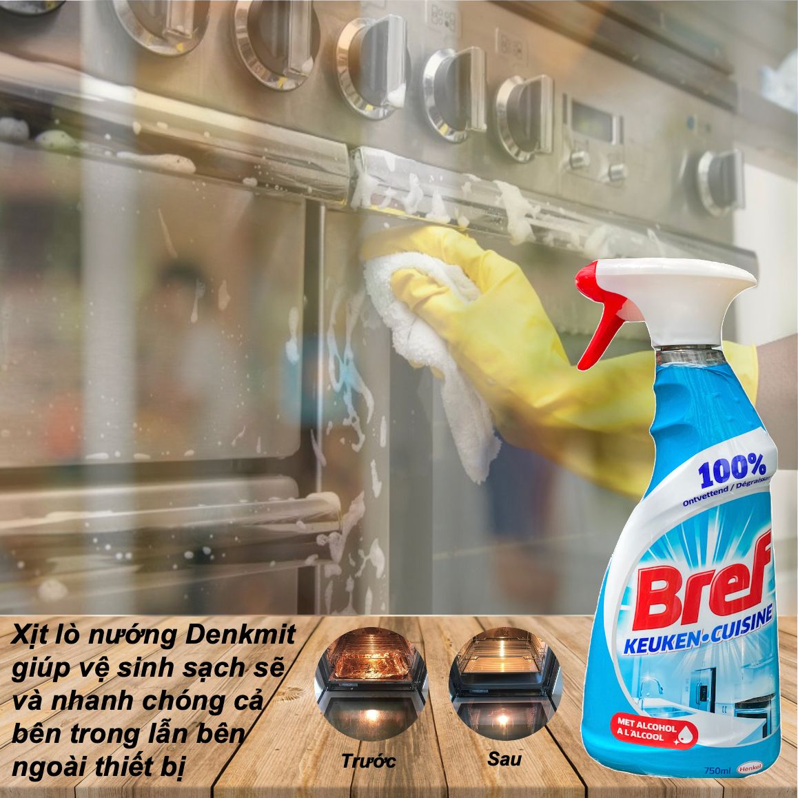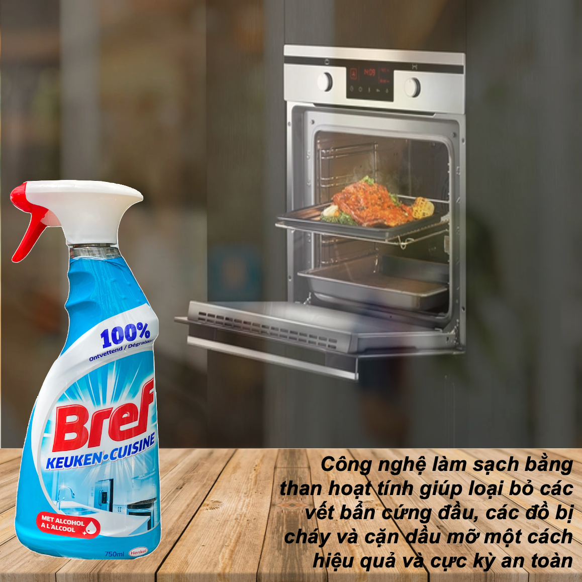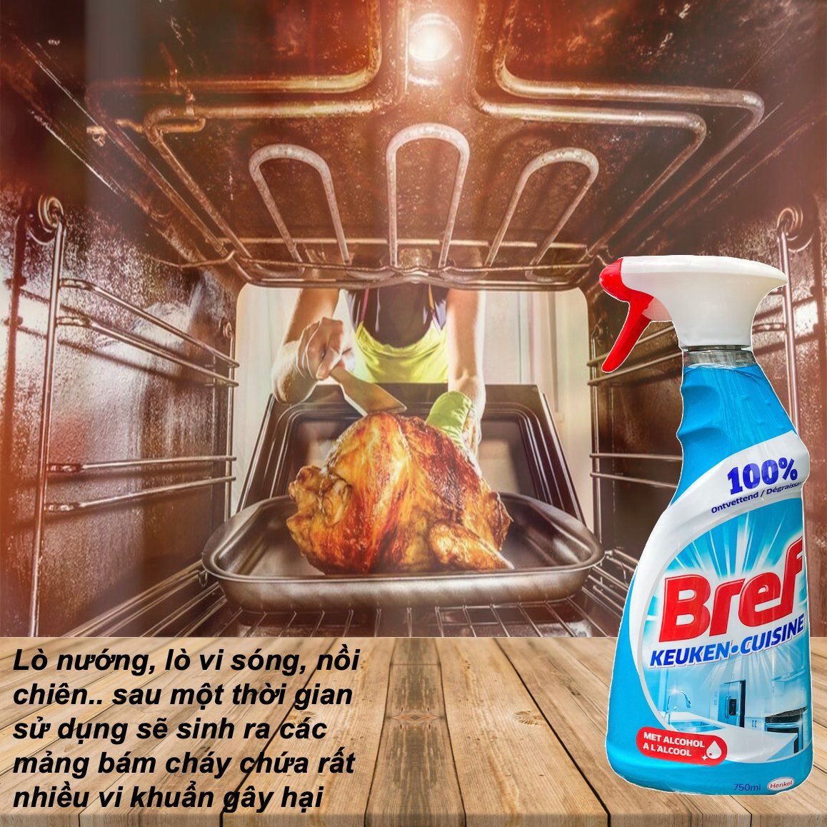 Dung dịch vệ sinh lò nướng, lò vi sóng, nồi chiên Bref là một sản phẩm khá là nổi tiếng của Henkel chuyên trị các vết bẩn cháy xém gây ra bởi đồ chiên nướng. Công thức dạng cồn sinh học giúp loại bỏ chất béo và đánh tan những mảng bám cứng đầu và những thứ bị cháy bằng cách làm mềm hoá vết bẩn sau đó chỉ việc lau nhẹ là sạch. Thành phần được chiết xuất từ những nguyên liệu thân thiện và an toàn với người sử dụng